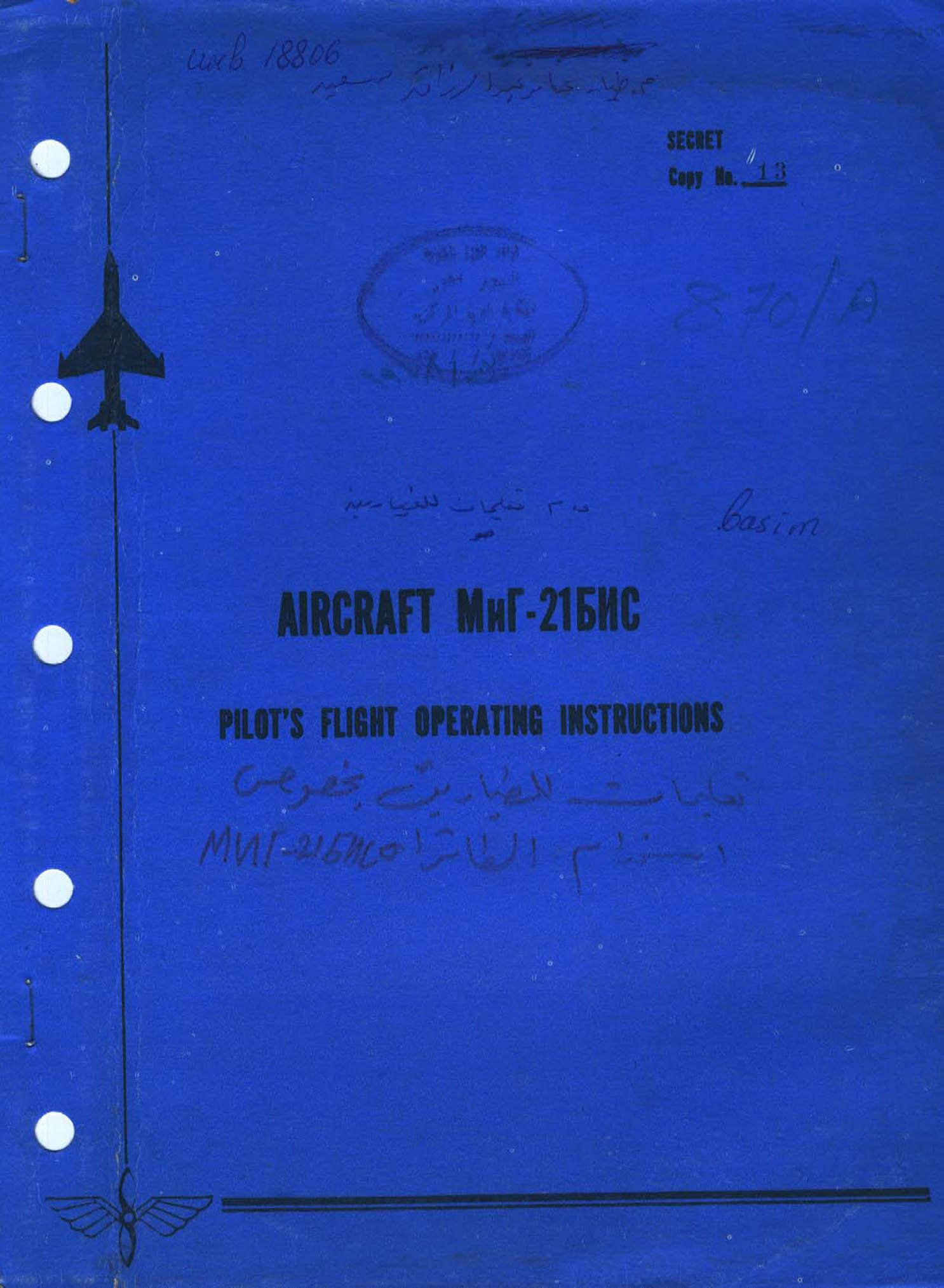 - Pilot’s Flight Operating Instructions for the MIG-21bis (75b), undated with approx. 229 pages. (In English). This was produced for export versions of the aircraft to a Middle East customer. (Has Arabic stamps on it.)