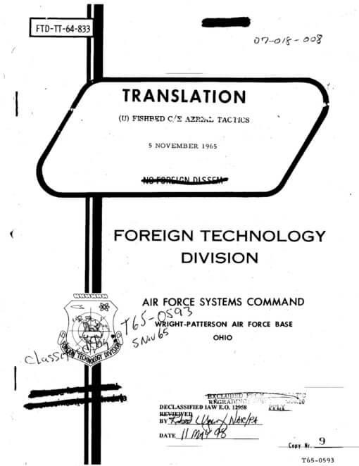 - Aerial Tactics for the Fishbed C/E (MIG-21). This is an English translation of the original Russian manual produced by the Foreign Technology Division of the USAF Systems Command. Report FTD-TT-64-883 dated 5 Nov 1965 with approx. 265 pages. A copy of the original Secret report.