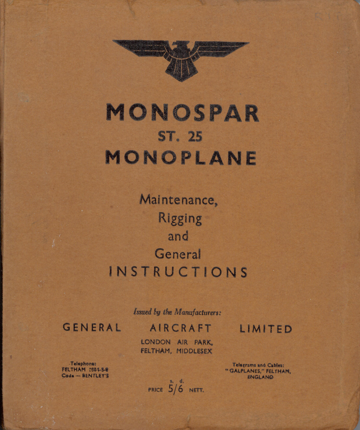 - Manufacturer produced Instruction Manual for the Monospar ST.25 Monoplane, titled “Maintenance, Rigging and General Instructions” (includes pilot’s notes), undated with approx. 30 pages of text and 10 illustrations.