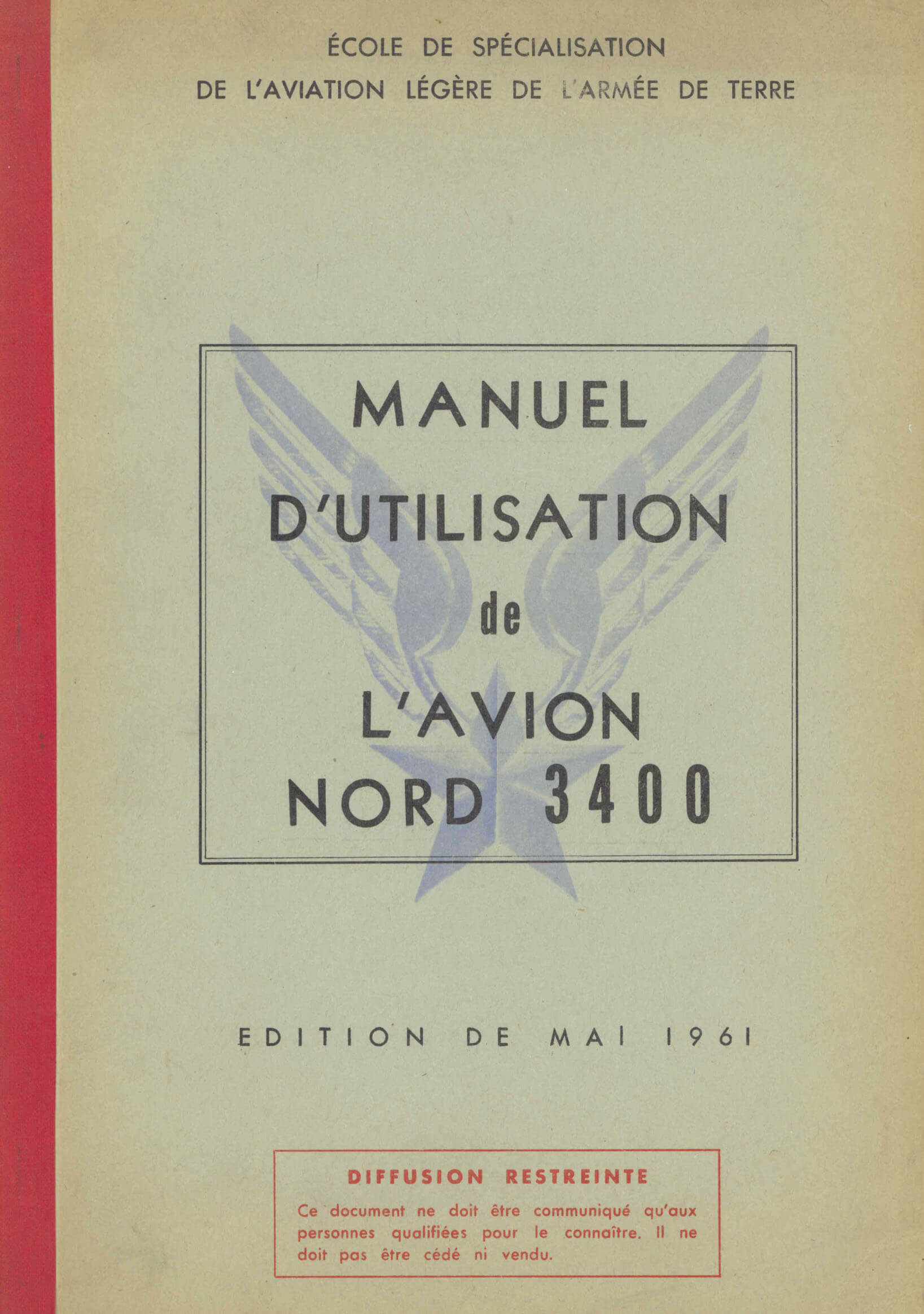 - Manuel D’Utilisation (Flight Manual) for the Nord 3400 produced by Ecole De Specialisation De L’Aviation Legere De L’Armee De Terre. Dated Mai 1961 with approx. 52 pages.