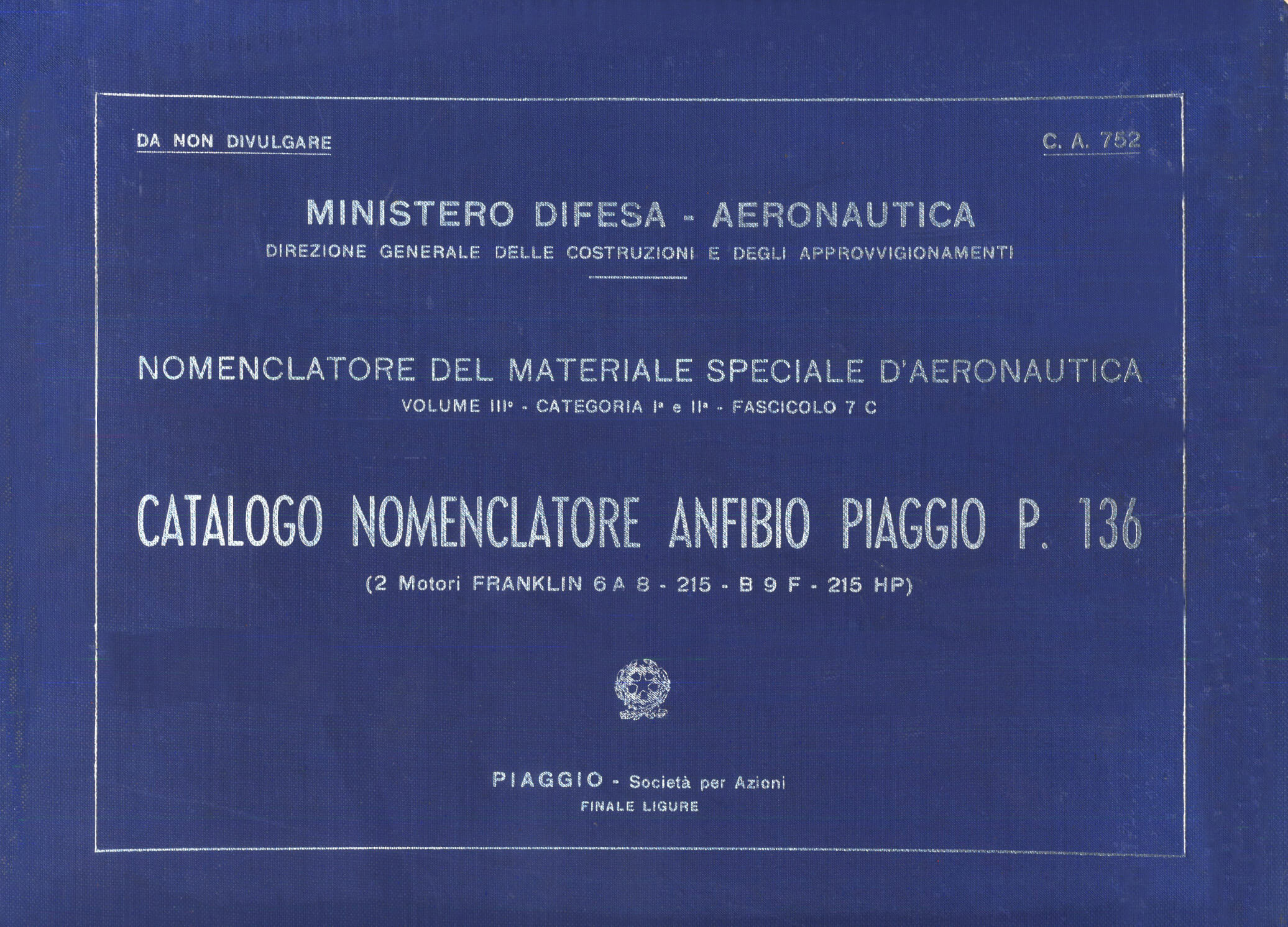- Italian Air Force Parts Catalog (Titled Catalogo Nomenclatore) for the Piaggio P-136. (The original Franklin engined version). Document C.A.752 dated 10-10-52 with approx. 431 pages. (In Italian).