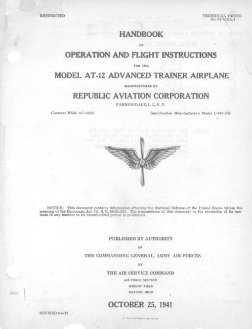 - USAAF Handbook of Operation and Flight Instructions for the AT-12, Technical Order 01-60KA-1 dated 25-10-41 revised to 6-5-42 with approx. 28 pages.