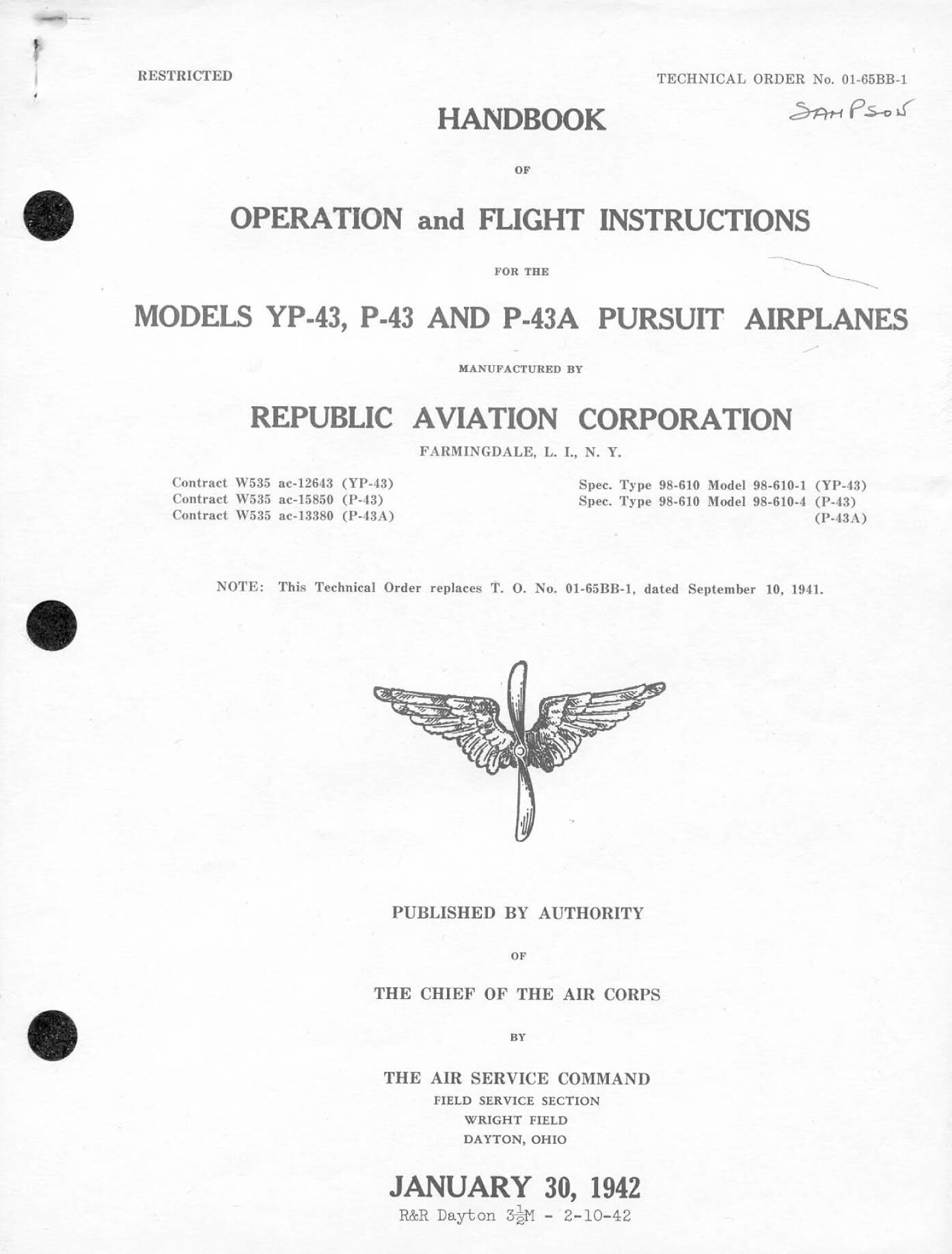 - USAAF Handbook of Operation and Flight Instructions for the YP-43, P-43 and P-43A, Technical Order 01-65BB-1 dated 30-1-42 with approx. 33 pages.