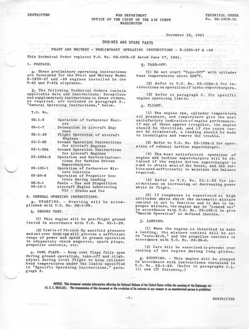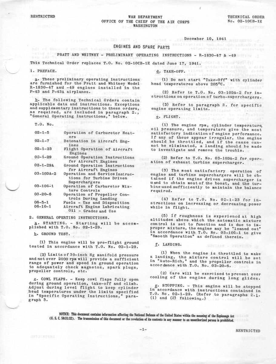 - USAAF Preliminary Operating Instructions for the Pratt and Whitney R1830-47 and -49 engines, used in P-43 and P-43A aircraft, Tech Order No 02-10CB-1E dated 10 Dec 1941 with 3 pages.