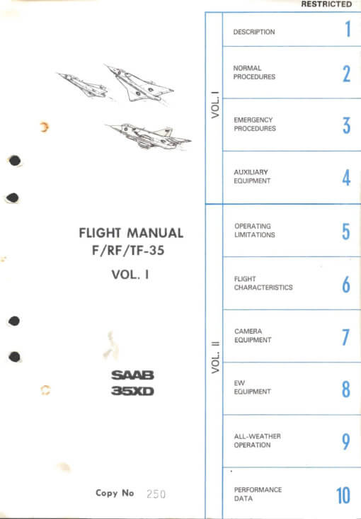 - Flight Manual for the F/RF/TF variants of the Saab 35XD Draken, as used by the Royal Danish Air Force, Publication HFLV 685-121 dated Jul 71, revised to May 92, with approx. 707 pages. This manual is in English and follows a format very similar to USAF manuals.