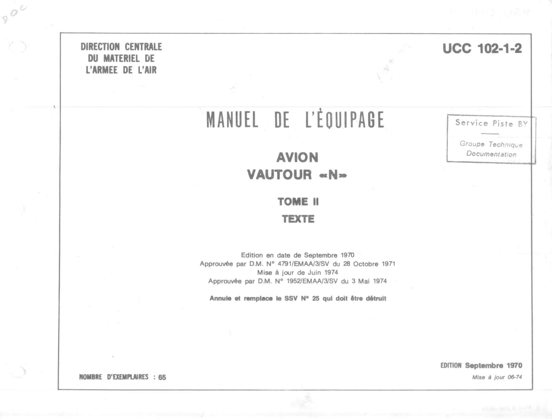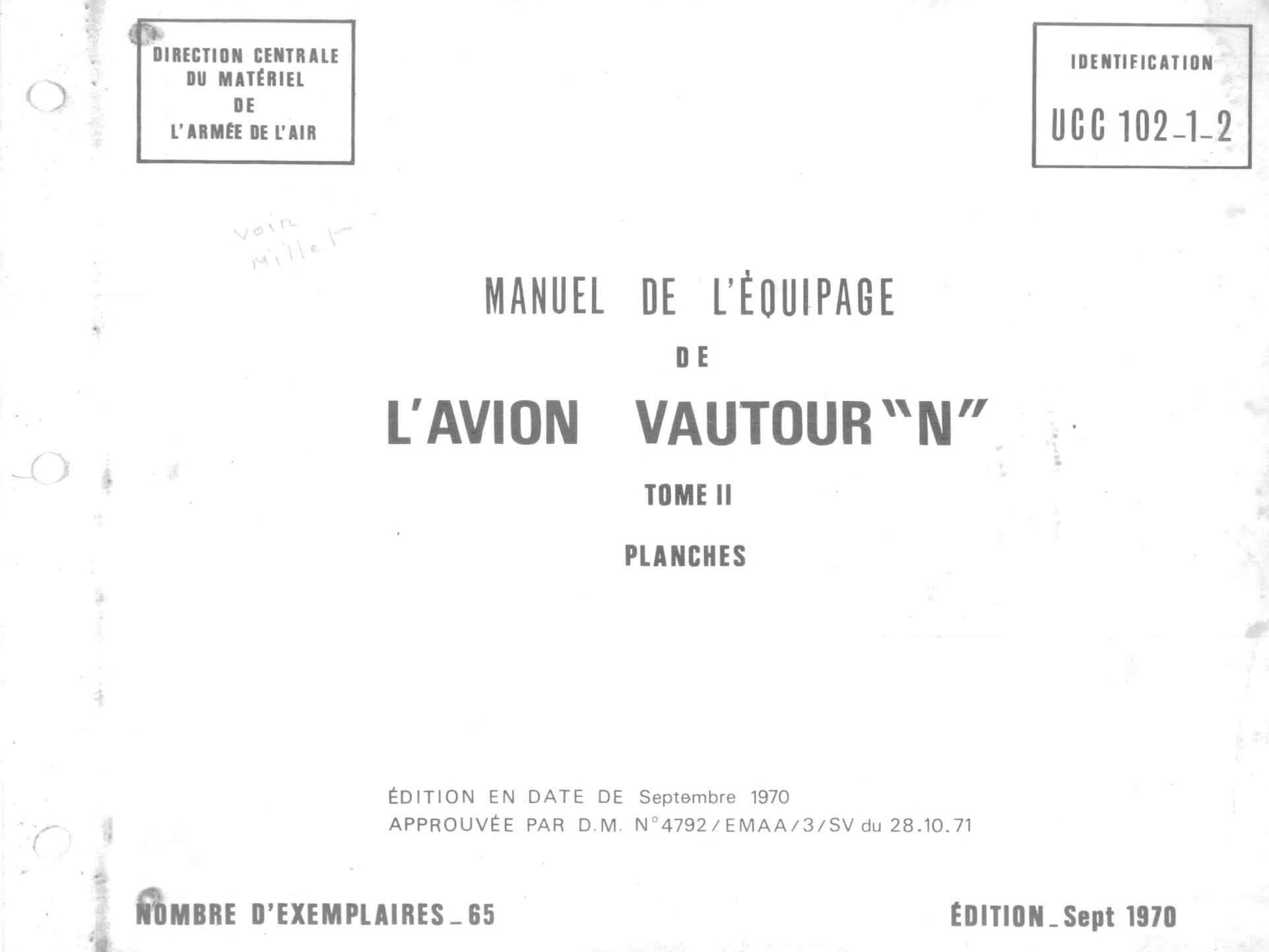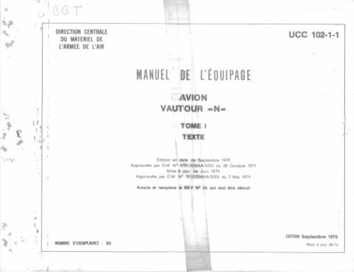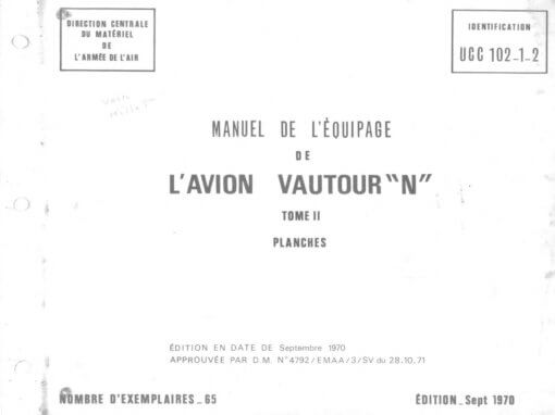 - Manuel de l’Equipage (Flight Manual) for the Vautour “N” in two volumes, Tome I and Tome II. Documents UCC 102-1 and UCC 102-2 dated September 1970. In the typical French format, each volume has two separate sections, one with text and the second with illustrations. In French.