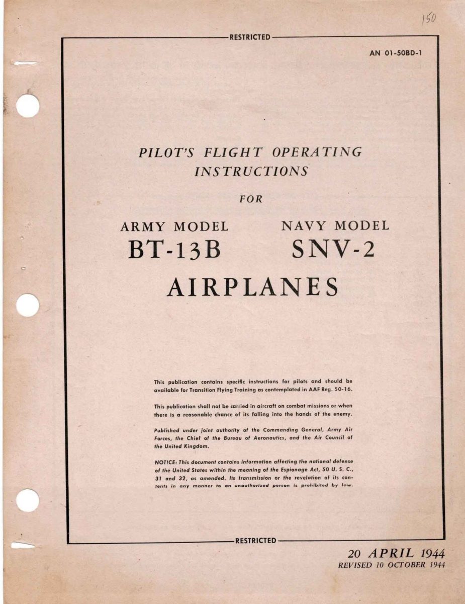 • USAAF Pilot’s Flight Operating Instructions for the BT-13B SNV-2, T.O. 01-50BD-1 dated 20-4-44 revised to 10-10-44, with approx. 56 pages.